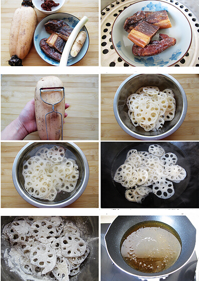 1.腊肉清洗干净,上锅蒸15分钟后取出,葱姜切碎,豆瓣酱同样剁碎备用,莲藕清洗干净后,刮去表皮,切片后入开水锅焯熟,捞出后控干水分,撒入两勺干淀粉拌匀,使每片莲藕都沾满干粉