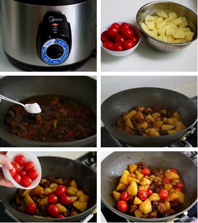 4.炖肉的时候准备好配菜:圣女果清洗干净,土豆切滚刀大块并浸泡在水中备用。
