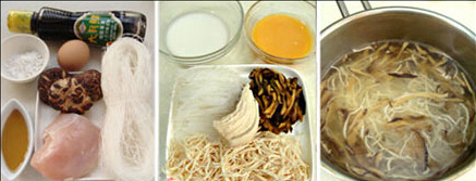 碗仔翅的材料:鸡胸肉100g、粉丝一把、干香菇3朵、鸡蛋一枚,老抽10毫升,芝麻香油一勺,马蹄粉一勺,清高汤1000毫升。
