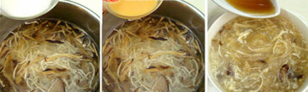 3、煮锅中倒入高汤,大火煮开后,加入鸡丝,冬菇丝,粉丝段,再次煮开后淋入芡汁搅拌均匀,沸腾后将调好的蛋液淋入锅中,等形成蛋花后用汤勺轻轻推散淋入麻油,老抽即可。