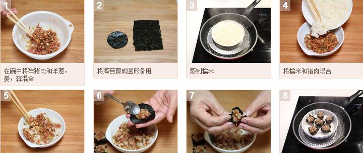 紫菜烧卖的材料:糯米120克,猪肉碎120克,葱20克,姜20克,洋葱40克,紫菜2-3大块 美食网