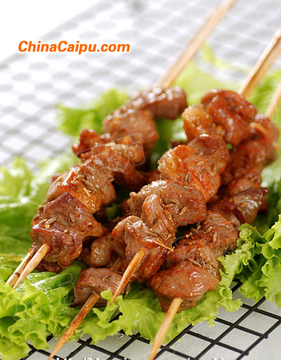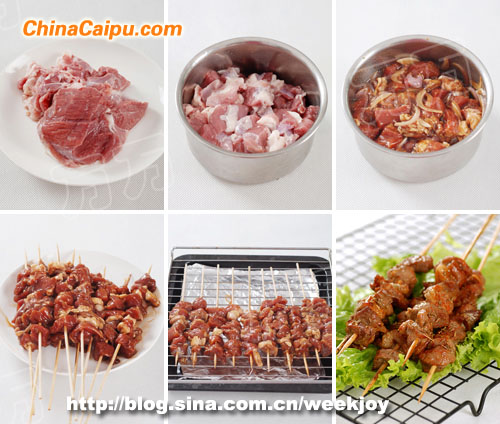 1.羊腿肉切小块,洋葱切丝,加入羊肉中,加生抽3汤匙,孜然粉1茶匙,油1汤匙,盐1茶匙腌制半天,过夜也可。(肉不可太瘦。肥瘦相间烤出来才好吃。)