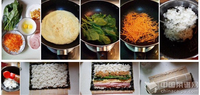五常香米、菠菜、鸡蛋、胡萝卜、火腿、肉松、腌萝卜