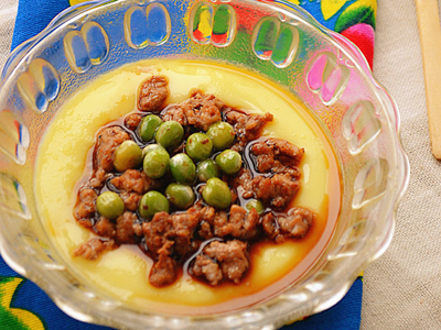肉末蒸蛋主料:鸡蛋1个 猪肉100克辅料:豌豆20克 蒸鱼豉油2茶匙 芡粉1茶匙 凉开水适量 酱油1茶匙 盐2克 食用油2茶匙做法:1.准备食材2.鸡蛋磕入碗里3.打散鸡蛋,加凉水,量是鸡蛋量的2倍左右4.加入芡粉,搅打鸡蛋液至表面气泡增多5.盖上保鲜膜,裹紧至碗周围没有缝隙6.水烧开后,放入打好的鸡蛋液,蒸6-8分钟即可出锅7.锅里加油,炒熟肉末和豌豆8.加酱油9.加盐10.把炒好的肉末豌豆盖到整好的鸡蛋羹上,淋上蒸鱼豉油即可
