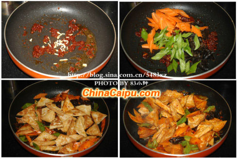 5.余油倒入豆瓣炒至出红油。加入姜末煸香。