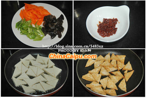 3.热锅上油,油热后放入切成三角形的老豆腐块。