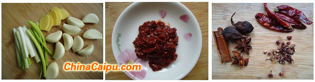 配料:葱、姜、蒜、冰糖、豆瓣酱、八角、桂皮、草果、干辣椒、花椒