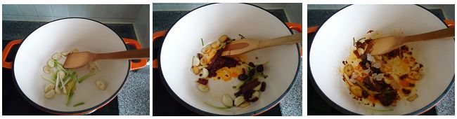 5、锅中加适量油,依次放入步骤4的各种配料和一小块冰糖,炒出香味。