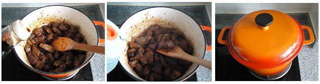 7、加入生抽,炒匀后加入开水,水量基本与牛腩齐平即可,大火烧开后转小火煲1小时。
