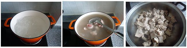 3、烧一大锅水,水开后加两片姜和适量料酒,放入牛腩,再次煮开后捞出并用温水洗干净血沫。