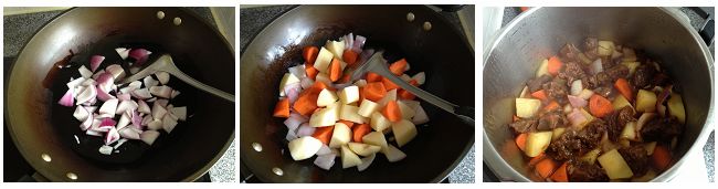 9、炒锅加少量油,小火炒香洋葱,再加入胡萝卜和土豆翻炒约3分钟,加入牛腩锅中,大火烧开后转小火煲约20分钟即可。