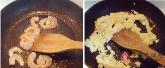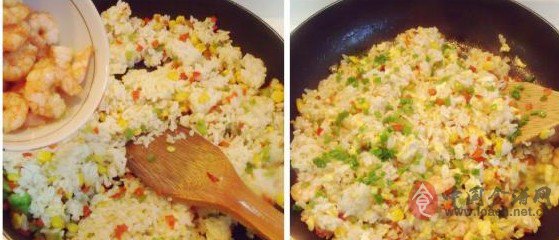 材料:虾10只,鸡蛋三个,玉米粒,青椒红椒,香葱,淀粉,盐,胡椒粉,米饭二人份。做法:1、 虾去头去尾挑去虾肠,只取虾仁,加料酒,盐,胡椒粉,少许淀粉拌匀腌制。2、 准备炒饭的材料:鸡蛋加少许盐打散,青椒红椒切小丁,香葱切碎。3、 锅烧热加油,将虾仁倒入翻炒至表面变色后捞出。4、 锅中余油将鸡蛋划散,凝固后即盛出。5、 再倒油,油热后将青椒红椒玉米粒一起下锅翻炒。6、 加入米饭不停翻炒,至饭粒干爽颗颗分明。7、 加入炒好的虾仁及鸡蛋。8、 加盐调味炒匀后撒入葱花出锅。