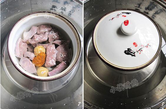 6、浸泡的猪肺捞起,滤净水,放入炖盅内,加入陈皮,冰糖和浸泡好的无花果,浸泡无花果的水也一起放入。