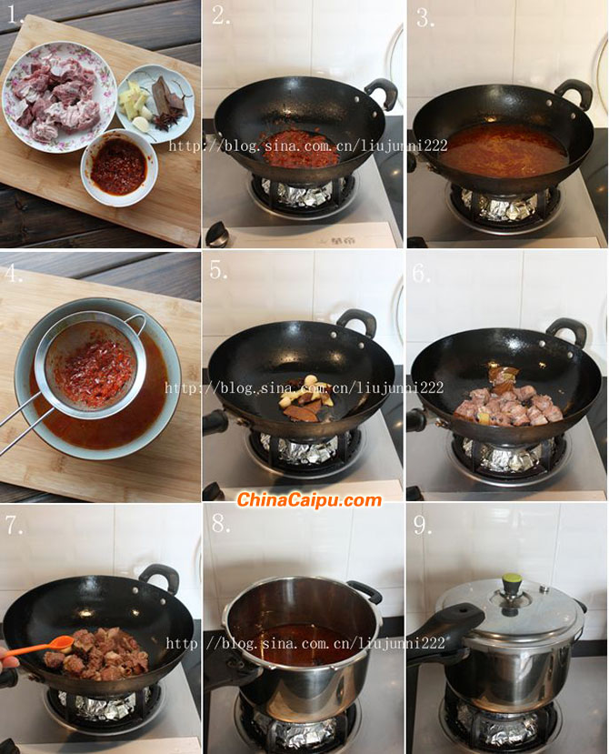 8.将炒好的牛腩与香料一起转入高压锅中,倒入过滤后的辣汤,加入盐和白糖;