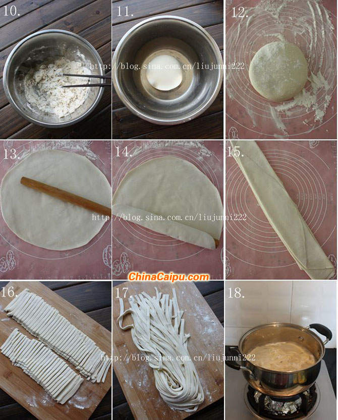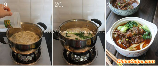 18.汤锅内放入适量的水,烧开,下入手擀面;