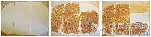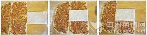 3.在面片上下方各切两刀,把一半肉馅抹到面片上;右上角不抹馅儿;将右上角向下叠过来