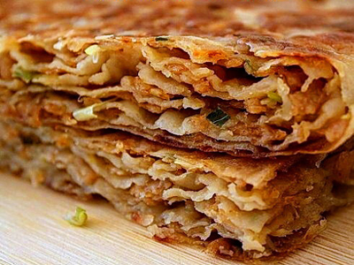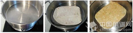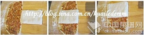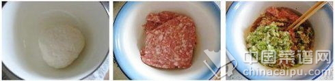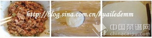 2.炒锅放2勺油烧热,下几粒花椒爆香后捞出关火,稍后把油浇在肉馅上面的五香粉和葱姜末上,把馅拌匀;取50毫升清水分三次倒入肉馅中,并顺着同一个方向搅拌肉馅,每次都要等清水完全进入肉馅中再加下一次继续搅拌,这样做出的馅,肉质鲜美多汁,这样馅就拌好了;将醒好的面团放在案板上揉至表面光滑,分成两份,取其中一份,沾少许面粉用撖面棍压着面团朝四个角撖,很容易撖成长方形