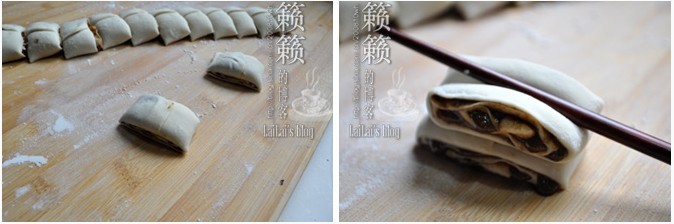 3-4.将圆面片卷成圆筒形状,刀切成均匀大小的小剂;取两块小剂将其叠加,包卷时的收口处相对,用一只筷子竖向逢中按压;