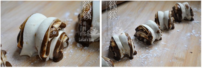 4-5.将筷子按压出痕的剂子两头捏合即成花卷生胚,依次两块剂子一组将所有花卷生胚制成;花卷生胚排入刷油的蒸屉内饧发30-40分钟(花卷生胚膨大,手指按压面胚可以迅速弹回),冷水起蒸中火蒸制20分钟即可。