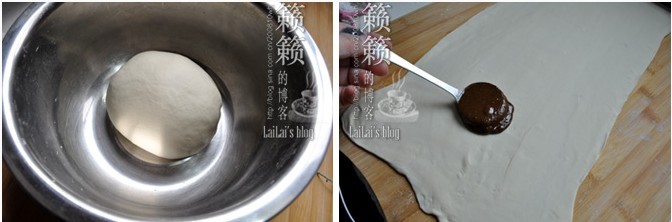 1-2.将酵母在温水中化开,静置3、5分钟;徐徐倒入面粉盆中,边倒边用筷子将面粉搅拌成雪花片状,再搓揉成光滑面团;案台上撒上手粉,将面团用擀面仗擀成长方形面片,芝麻酱加入糖、盐混合均匀,涂抹在面片上;