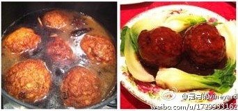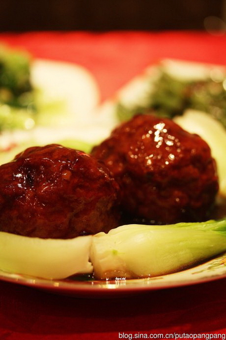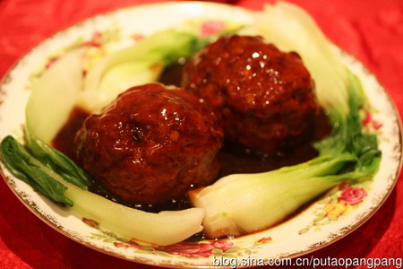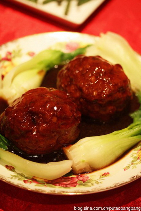 注意:最后盛盘,浇汁前,可以取一部分汤汁,单独用生粉勾一下芡,浇在狮子头上,色泽更好,味道也更浓: