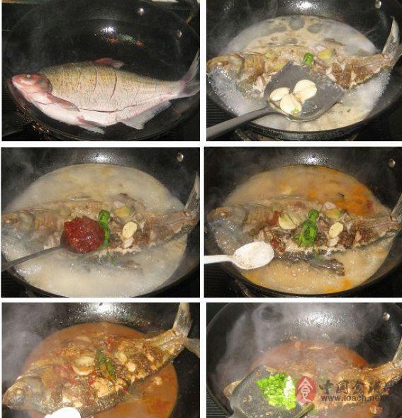 2.两面煎好,加适量清水,放下葱结,蒜头,姜片.