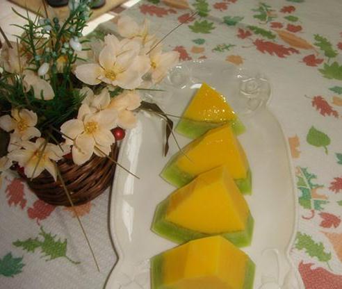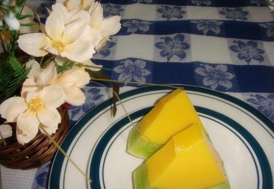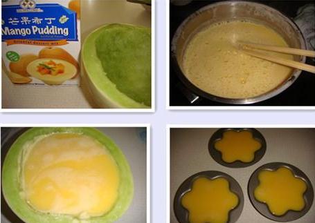 香甜哈密瓜芒果布丁材料:芒果布丁粉一合,半个哈密瓜去囊待用。做法:1)按芒果布丁粉的说明加牛奶和清水以中火煮开然后熄火。2)立即将芒果布丁粉倒入烧开的牛奶中不停的搅匀,然后倒入准备好的哈密瓜里和花形模具里。3)放到雪柜里凝固以后拿出来切块和倒出模具。呵呵,很漂亮的哈密瓜芒果布丁就展现您的面前。