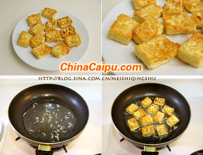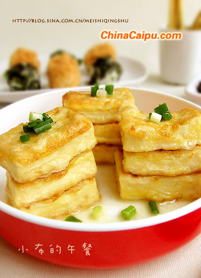 3.吸去豆腐表面的水分,然后裹上一层干面粉,接下来裹一层蛋液,放入平底锅中,中小火煎成金黄色的豆腐片~