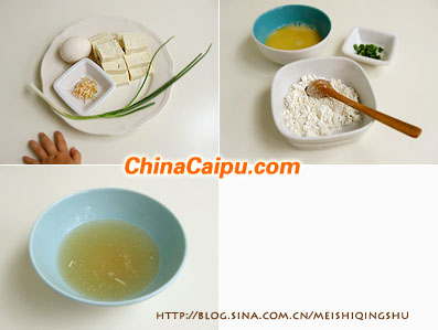 1.备齐材料,北豆腐洗净切片,加一点盐腌一下;鸡蛋打散~