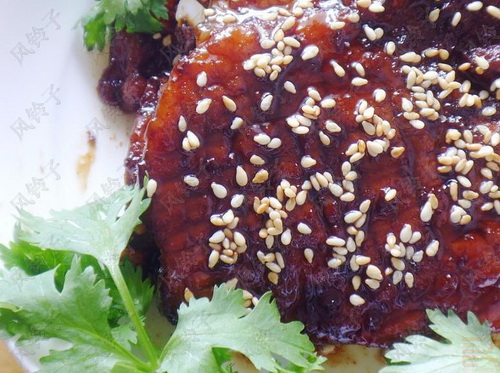 原料:大排骨4个,蜂蜜,白芝麻少许。 调料:生抽老抽,冰糖,葱姜 事先准备: 1.白芝麻烧熟,备用。 2.大排用刀背拍松。 蜜汁排骨的做法 1.大排汆水后,加入盐料酒腌制15分钟, 2.起油锅,把排骨煎至两面发黄。 3.加入生抽、老抽、蜂蜜,冰糖,清水,翻拌匀,大火烧开。 4.加盖,转中火焖煮约20分钟,至软。 5.开盖,大火收至汤汁浓稠即可。 6.装盆,洒上白芝麻即可。 排骨营养价值 猪排骨提供人体生理活动必需的优质蛋白质、脂肪,尤其是丰富的钙质可维护骨骼健康。