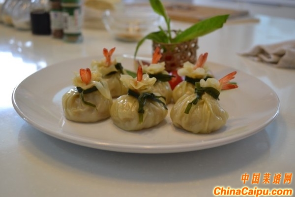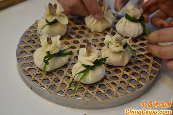 4.最后用备好的韭菜在烧卖包口处打好蝴蝶结,制作好的烧卖排盘放进电锅,加1量杯水,盖上锅盖蒸煮15分钟,即可