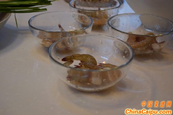 1.将鲜虾切头去壳,用加入盐糖腌制5分钟备好,韭菜洗净,电锅倒进2量杯水烧开,韭菜先过热水,使韭菜变软备用