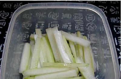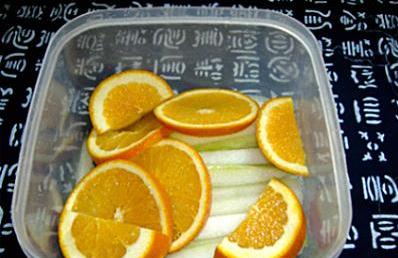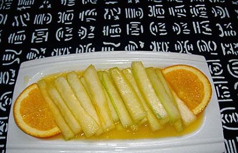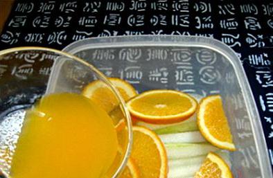 材料: 橙子两个,冬瓜500克 做法: 1.选新鲜的冬瓜,去皮,要多去点皮,否则影响口感。切成均匀的长条,放盐腌制15分钟 2.腌制好的冬瓜用冷开水冲洗干净 3.拿一个橙子切片摆在冬瓜条上,另一个橙子榨汁 4.将橙汁浇在冬瓜条上,盖上盖子,放冰箱,(如果盘中没盖子,要敷上保鲜膜) 5.2小时后,酸酸甜甜的橙汁冬瓜做好啦