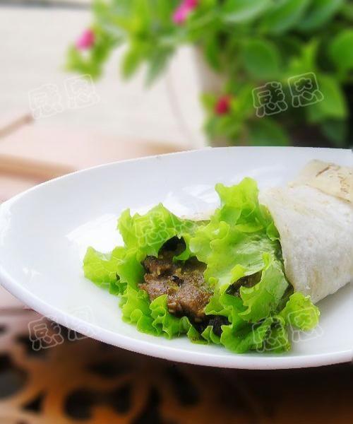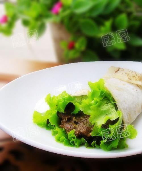 8.放上一块煎好的牛排,卷起即可食用。