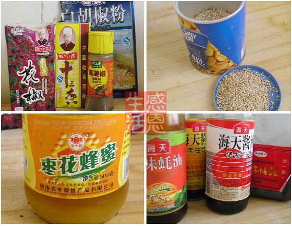 调料:蜂蜜 白芝麻 食盐 味精 老抽 生抽 十三香 花椒粉 胡椒粉 黑胡椒粉 芝麻油 蚝油