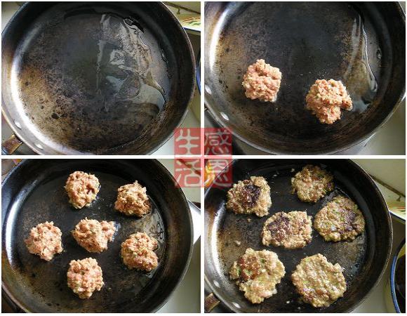 6.将搅拌好的肉馅团成团放入锅内。