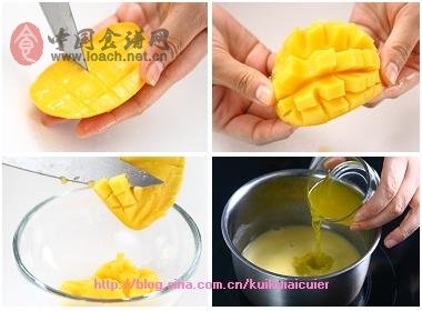 材料:吉利丁片10克(2片)芒果汁60克 牛奶40克 糖40克 芒果肉200克 鲜奶油100克