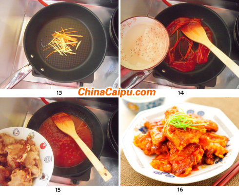 14.倒入步骤5里稀释过的番茄酱,炒出红油后倒入用醯官醋调和的酸甜汁。