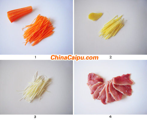 其他材料:里脊肉或梅花肉350克、胡萝卜1/3根,生姜1/3块,大葱1/4根,盐少许,料酒5克,玉米淀粉55克,面粉5克,食用油少许,勾芡用的淀粉水5克。