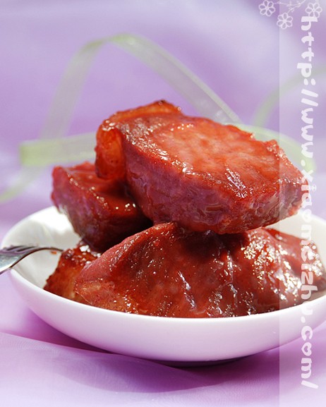 做法:肉切小块,抹上叉烧酱,每一块都抹匀。腌制过夜。肉放烤网,底下放铺锡纸的烤盘。烤箱预热220度,20分钟。每5分钟拿出刷一次叉烧酱。