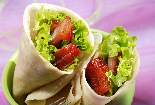 做法:春饼上铺生菜,放切片的叉烧肉,卷起即成。
