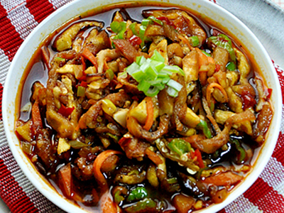 鱼香茄子材料:长茄子、胡萝卜、青椒、香菇、葱姜蒜、剁椒酱、豆瓣酱调味料:盐、糖、醋、酱油、鸡精、花椒粉、料酒做法:1、蔬菜类洗净切成丝。茄子切成条。葱姜蒜剁碎。2、盐、糖、醋、酱油、鸡精、花椒粉调成一小碗料汁。3、热锅倒油,油量要大,将葱姜蒜末和剁椒酱豆瓣酱放入锅内,炒出香味。4、放入蔬菜。翻炒。5、蔬菜变软后,倒入调料汁,翻炒均匀,即可。小贴士:要想茄子少吸油,可以事先浸泡盐水,在裹一层淀粉,处理后再炸。