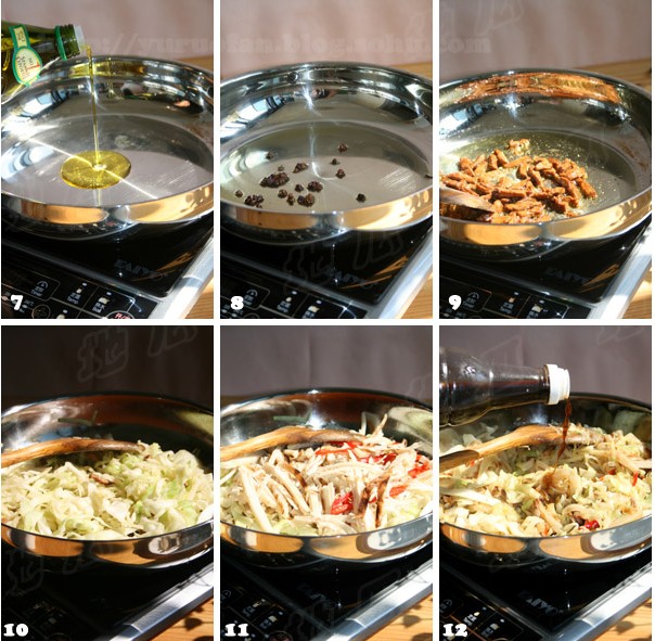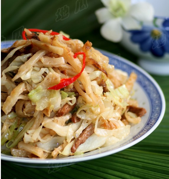 3、待肉丝变色后放入白菜丝翻炒几下后倒入饼丝、红椒丝一起翻炒2分钟