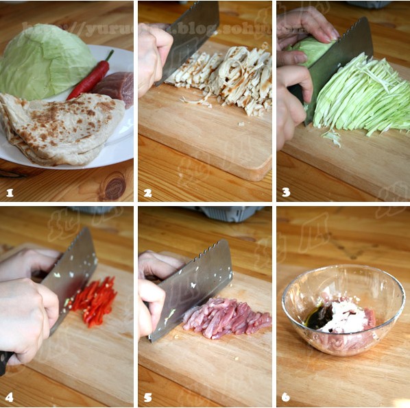 材料:烙饼200克 圆白菜(包菜)半粒 里脊肉100克 大葱少许或花椒少许 红椒1根 生抽2汤匙 老抽1汤匙 淀粉少许 料酒少许 味精少许 醋适量