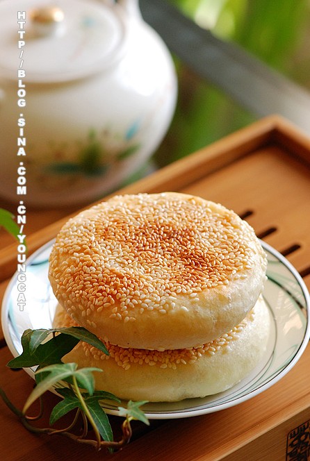 11、取平锅,在锅底刷上一层薄油,微火,将饼坯放入(芝麻面朝下),盖上盖,待饼完全发起,芝麻面发黄后,翻面,盖上盖再焖烤至此面发黄即成。