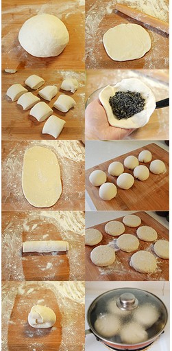 面团材料:面粉300克,温水160克,干酵母4克,碱水适量(约60克/个,约8、9个)
