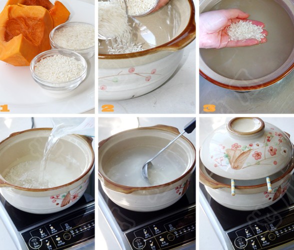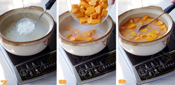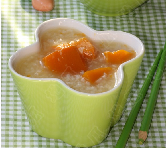 清甜南瓜粥材料:去皮南瓜300克 香米50克 糯米30克 清水1.5升作法:1、将南瓜掏去内瓤后,洗净、去皮切小块备用;2、将香米和糯米一起倒入砂锅内,然后用水冲洗干净,再一次性倒入1.5升清水,搅拌一下后用大火煮开;煮开后转小火,然后在锅面上放两根长筷子,再将锅盖放在筷子上,煮15-20分钟;中途不时用汤匙搅拌以防粘底;3、15-20分钟后,米粒被煮开,这时倒入切好的南瓜块,搅拌均匀后再以中火煮15分钟到米粒软烂即可