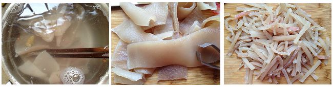 3、煮过的肉皮捞出,仔细削干净里面的肥肉,并将毛拔干净,清洗干净后切成细条。