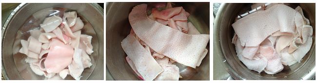 1、猪皮用水浸泡半小时,初步刮去多余的肥肉,再清洗干净。