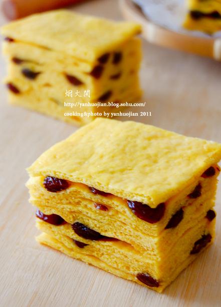 4、再擀一个面饼叠放在上面,同样在上面刷油、撒上白糖和葡萄干